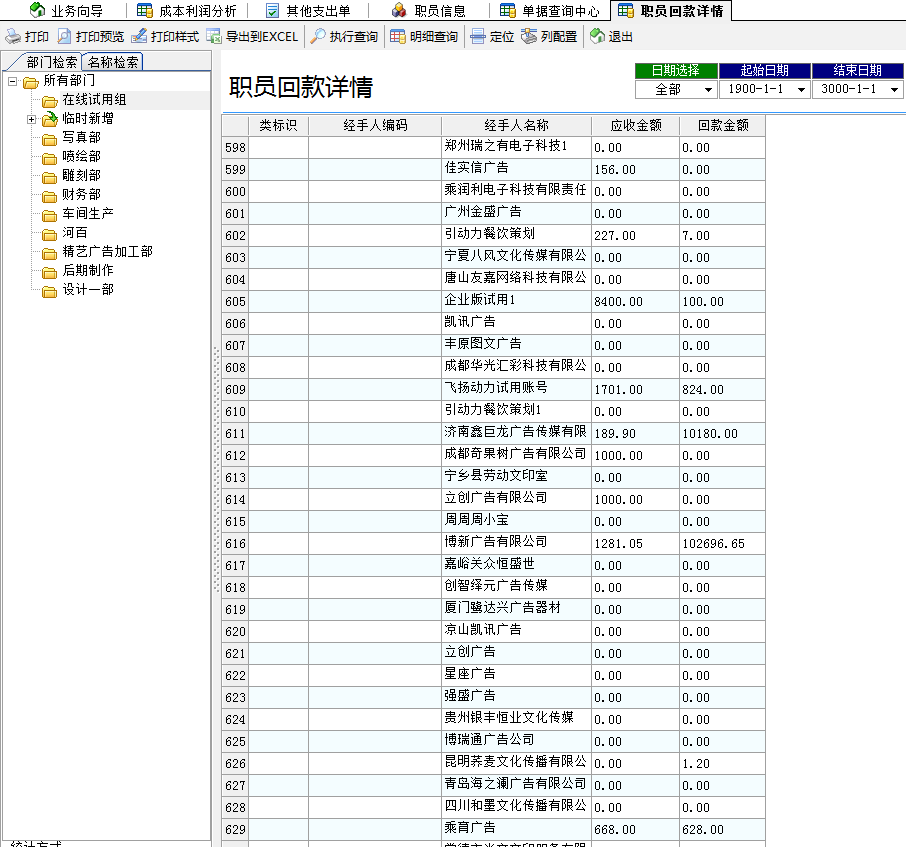 飛揚(yáng)動(dòng)力廣告公司管理軟件可以根據(jù)員工的不同,查看每個(gè)員工所開(kāi)單據(jù)的回款情況和欠款情況。這樣可以根據(jù)每一個(gè)員工的具體情況,來(lái)進(jìn)行查看回款詳情,同時(shí),也方便員工對(duì)自己特定的客戶進(jìn)行對(duì)賬或是催款。