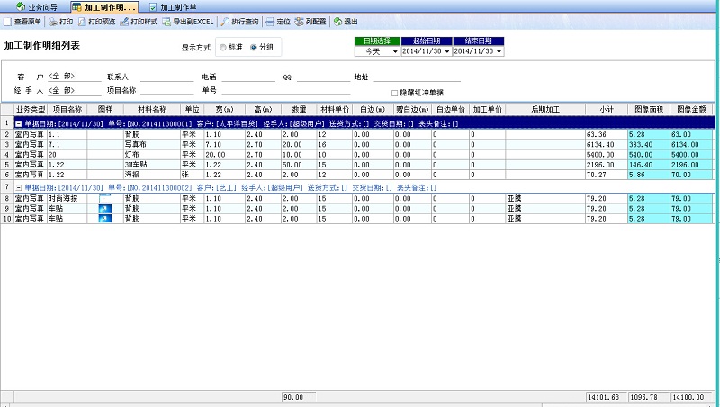 (1)首先,要查詢今天開過多少加工制作單,可以在“報(bào)表查詢”中,的“加工制作明細(xì)”中查詢,具體做過哪些單據(jù),以及單據(jù)的一些明細(xì)信息,包括單據(jù)明細(xì)小計(jì)、圖像面積、圖像金額等一些相關(guān)信息。該報(bào)表也可以通過菜單欄中的打印,打印成紙質(zhì)單據(jù)做一個(gè)賬目保存,或者是通過菜單欄中的“導(dǎo)出到Excel”,做成電子表格的方式。