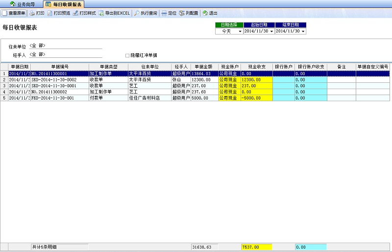 (2)每天的結(jié)算,就直接使用噴繪記賬軟件的“每日收銀報(bào)表”就可以把收入和支出進(jìn)行統(tǒng)計(jì),包括單據(jù)類型、往來單位、經(jīng)手人、單據(jù)金額、現(xiàn)金收支等具體的信息。每日收銀報(bào)表也是可以進(jìn)行打印和導(dǎo)出為Excel表格。