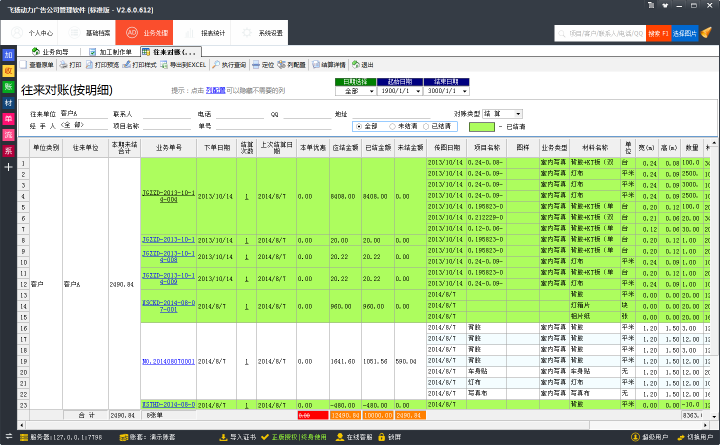 飛揚動力廣告公司管理軟件在對賬的時候,可以將所制作的圖片信息直接導(dǎo)出,或是直接打印出來。這樣,就方便跟客戶進行對賬。在進行對賬的時候,也可以篩選已結(jié)清,或是為結(jié)清的客戶進行單獨的對賬。