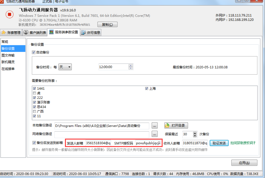 為了避免客戶因硬盤(pán)損壞或者重裝系統(tǒng),格式化所有磁盤(pán),造成主機(jī)電腦所有數(shù)據(jù)丟失的情況,飛揚(yáng)動(dòng)力廣告公司管理軟件新增郵箱備份功能??蛻艨梢栽O(shè)置好郵件備份,軟件每天都把備份數(shù)據(jù)發(fā)送到你們自己的郵箱,即使主機(jī)電腦造成不可恢復(fù)的數(shù)據(jù)丟失,也可以通過(guò)郵箱備份的數(shù)據(jù)進(jìn)行恢復(fù),讓數(shù)據(jù)安全更有保障。那么如何將賬套數(shù)據(jù)備份到郵箱呢?具體操作步驟如下: