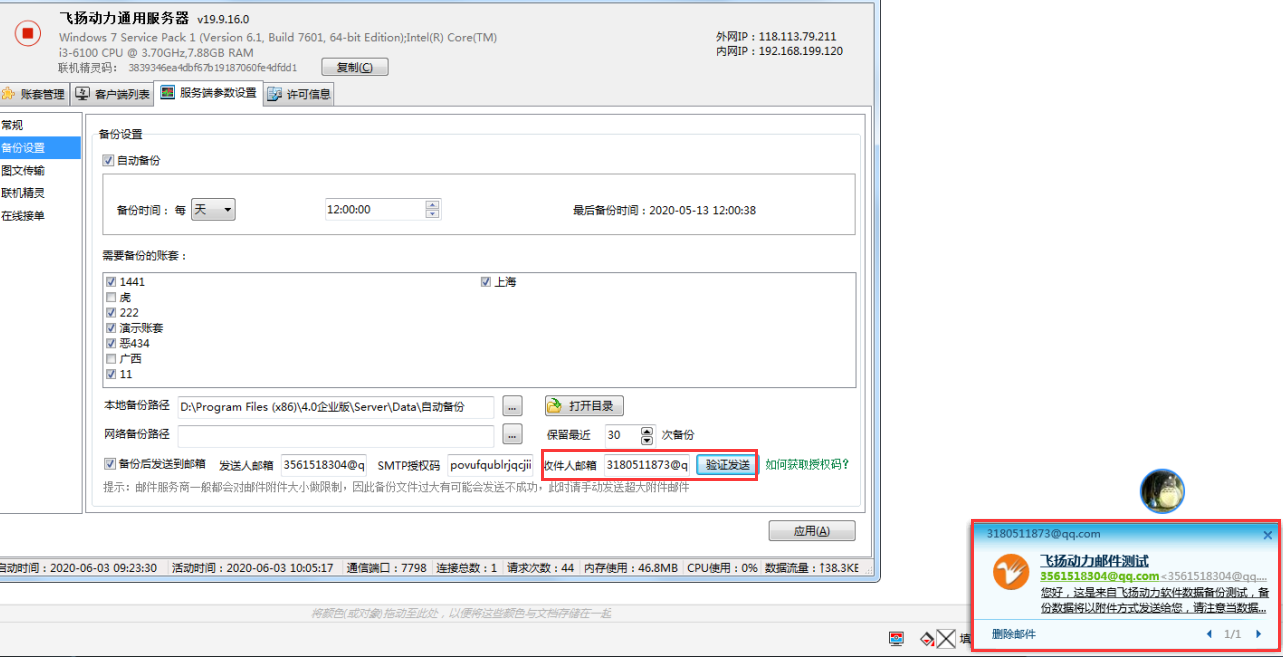 5.在收件人郵箱中填入收件郵箱,點(diǎn)擊驗(yàn)證發(fā)送,若能收到郵件則表明設(shè)置成功。以后每天自動(dòng)備份時(shí),都能收到備份的郵件信息