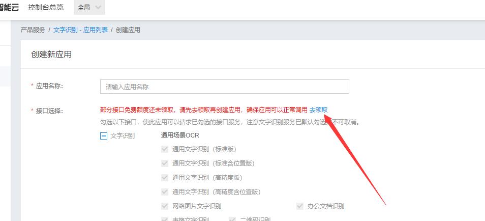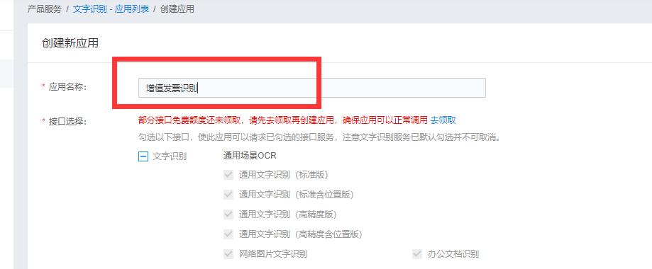 5.選擇文字識別的內(nèi)容,我們主用使用增值稅發(fā)票識別功能,所以選擇相應(yīng)項(xiàng)即可,后期飛揚(yáng)動力支持更多的AI應(yīng)用時,仍然可以再次免費(fèi)申請其它服務(wù)