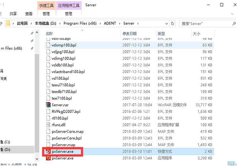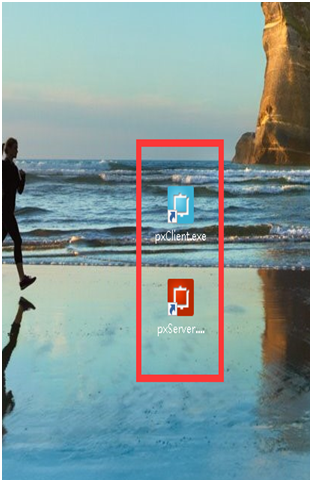 在路徑為D:\Program Files(x86)\ADSTART\Server的文件夾下,找到pxServer.exe這個文件,同樣也創(chuàng)建一個快捷方式,并放到系統(tǒng)桌面,如下圖所示: