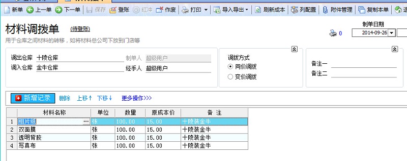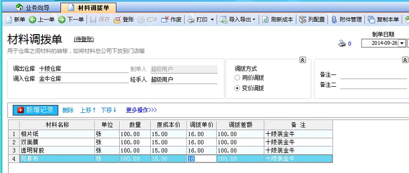 第三、在材料調(diào)撥單明細(xì)中,選擇需要調(diào)撥的材料名稱,填寫調(diào)撥數(shù)量,原成本價,如果是變價調(diào)撥還需要填寫調(diào)撥單價,備注等信息。