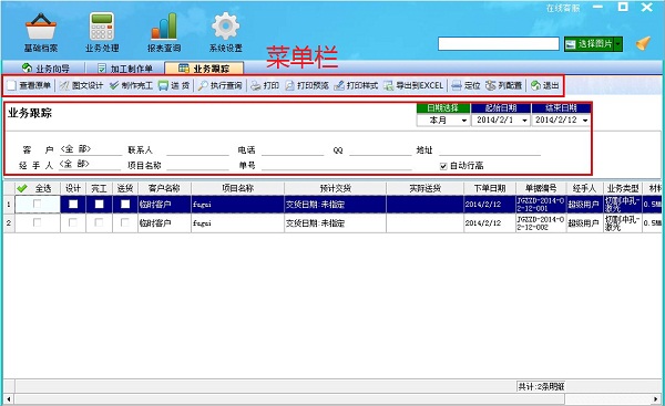 在業(yè)務(wù)跟蹤的菜單欄中主要有一下幾項(xiàng)功能:1.查看原單;2.圖文設(shè)計(jì);3.制作完工;4.送貨;5.執(zhí)行查詢;6.打??;7.打印預(yù)覽;8.打印設(shè)置;9.導(dǎo)出到Excel;10.定位;11.列配置;12.退出;