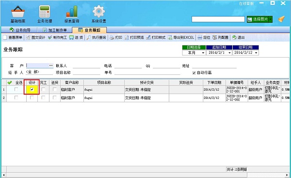 如果訂單只是開好,但是還沒有進(jìn)行設(shè)計(jì),那么就讓設(shè)計(jì)部門的設(shè)計(jì)人員把訂單中的項(xiàng)目設(shè)計(jì)完成,完成后就在業(yè)務(wù)跟蹤菜單欄點(diǎn)擊“圖文設(shè)計(jì)”,填寫好信息后點(diǎn)擊確定,在業(yè)務(wù)跟蹤界面列表信息中的“設(shè)計(jì)”一欄就會(huì)顯示為黃色背景并勾選,如圖2所示