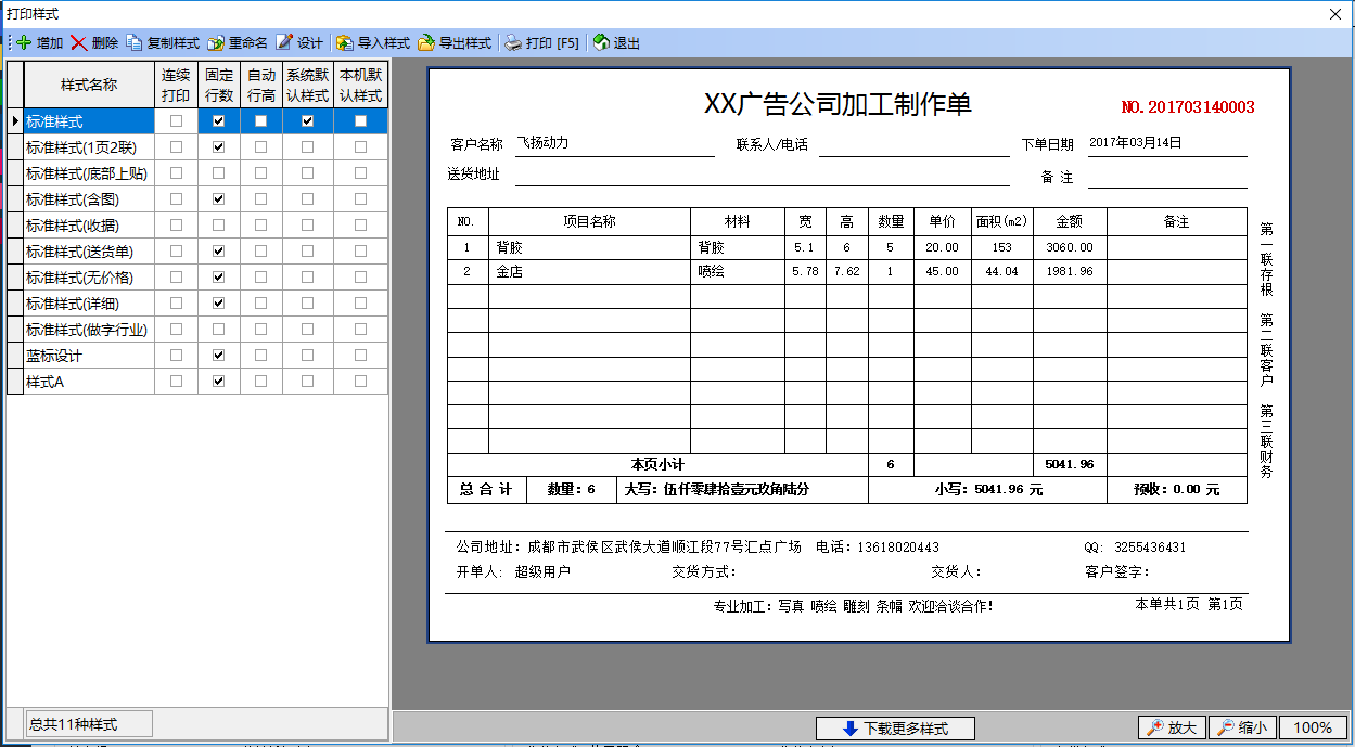1.可以在加工制作單中直接進行打印,送貨,對賬收款。(注:打印樣式可以選擇不同的樣式進行打?。?/span>